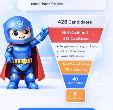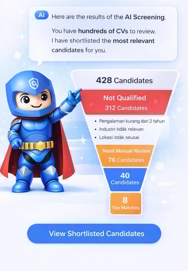 Upload CV kandidat dan dapatkan Fit Score, skill match, red flags, dan rekomendasi keputusan. Tidak perlu baca satu per satu, hanya fokus ke yang benar-benar layak.